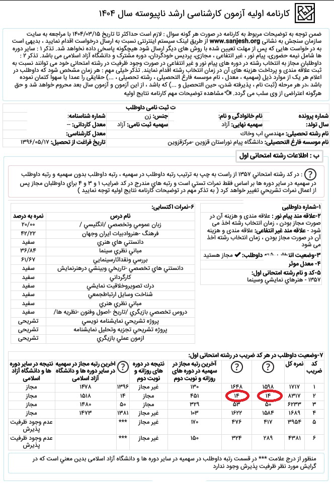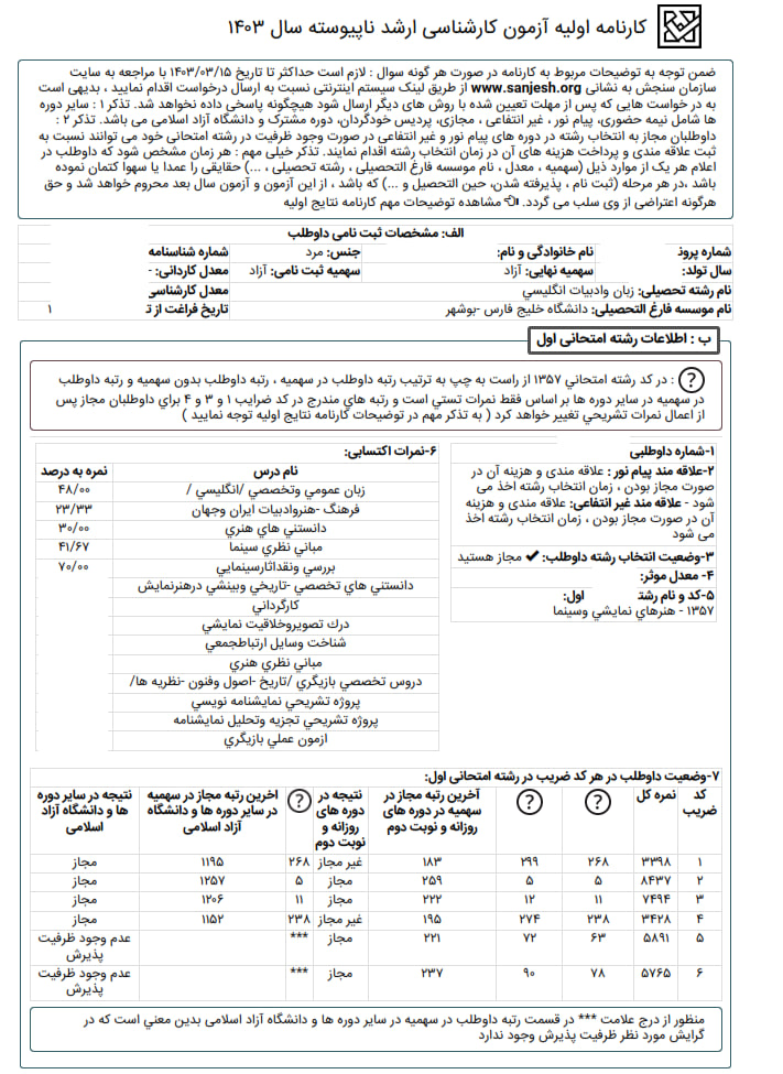 کارنامه زیر اما رتبه ۵ کنکور ارشد ۴۰۳ بوده اند.