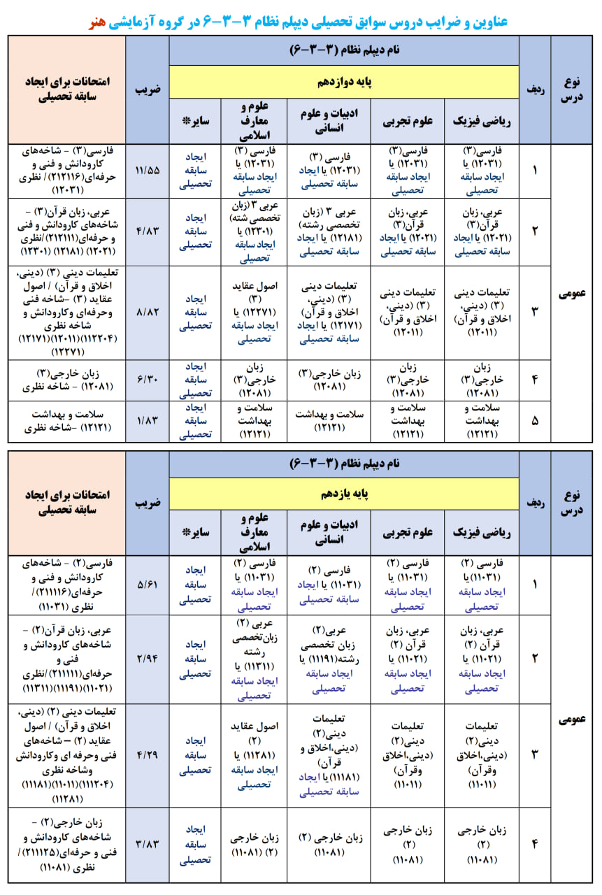 معدل در کنکور هنر ۳۰ درصد تاثیر دارد و از دروس یازدهم و دوازدهم زیر اعمال خواهد شد.